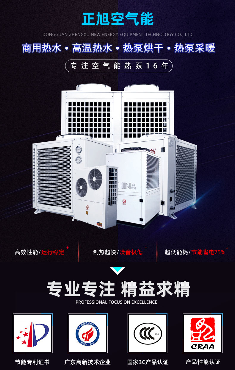 我司主要生產(chǎn)空氣能熱泵冷暖、熱泵烘干、高溫?zé)崴?、商用熱水設(shè)備四大系列,全國2000家經(jīng)銷商,公司資質(zhì)齊全,3000售后點,8000多個工程案例。選擇正旭=15年研發(fā)實力+合理價格+高端品質(zhì)+優(yōu)質(zhì)售后+代理扶持+24小時400服務(wù)電話。 正...