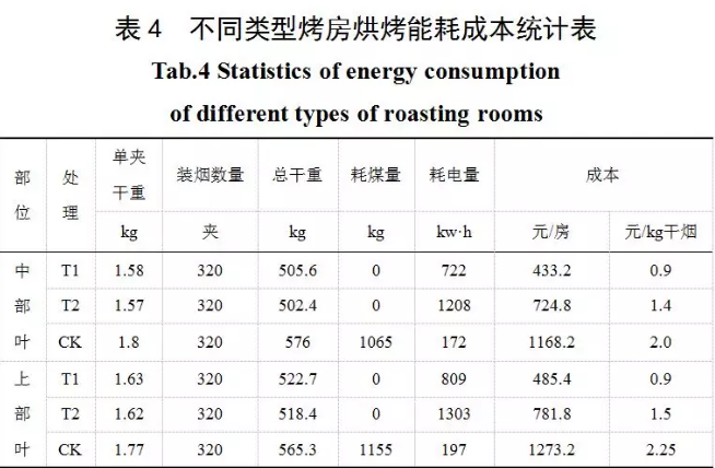 從表4可知,各處理烘烤能耗成本相比,T1能耗成本最低,中部葉和上部葉每千克干煙的成本均為0.9元;對照CK能耗成本最高,由煤和電兩種能源構成,中部葉和上部葉每千克干煙的成本分別為2.0元和2.25元;T2能耗成本居中,中部葉和上部葉每千克干煙的成本分別為1.4元和1.5元。以上結果表明,T1處理的烤房具有明顯的節能效果,比對照CK烤房可節省1.1-1.35元/kg干煙。
