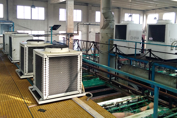 作為一款新型節(jié)能環(huán)保的設(shè)備,空氣源熱泵在生活熱水、居民采暖及農(nóng)業(yè)領(lǐng)域上的應(yīng)用已廣泛被市場接受,但在工業(yè)領(lǐng)域卻不被人們所熟知。其實(shí),空氣源熱泵目前也能成熟的應(yīng)用在印染、電子、電鍍等工業(yè)領(lǐng)域,幫助客戶有效節(jié)能減排、省錢增效。以正旭在山東某電鍍廠的高溫?zé)崴?xiàng)目為例,客戶提出對其鍍鎳、鍍鉻生產(chǎn)線進(jìn)行節(jié)能改造,經(jīng)實(shí)地調(diào)研并與廠方多次深入溝通,我們?yōu)槠渑渲昧?P、7P、10P、13P高溫機(jī)共27臺空氣源高溫?zé)岜茫ǚ鷻C(jī)+鈦管),總制熱量達(dá)到735KW,滿足了客戶生產(chǎn)需求,每年為客戶節(jié)能上百萬元電費(fèi),得到了客戶的高度評價(jià)。